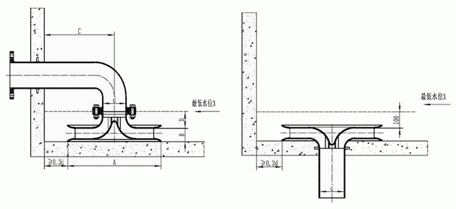 3、安裝要求:旋流防止器的外緣與水池池壁應(yīng)至少留有0.3d的間隙,d為吸水管到的公稱(chēng)尺寸。
