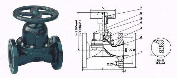 部件列表:1、閥體 2、閥體襯里 3、隔膜 4、閥瓣 5、閥桿 6、閥蓋 7手輪