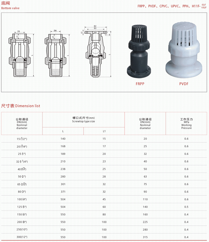 塑料底閥是一種節(jié)約能源的閥,一般安裝在水泵水下吸管的底端,限制水泵管內(nèi)液體返回水源,起著只進(jìn)不出的功能。閥蓋上有很多個(gè)進(jìn)水口和加強(qiáng)筋,起到了不易堵塞,主要應(yīng)用在抽水的管路上。水道和支承的作用.口徑有單瓣、雙瓣、多瓣型,有法蘭連接和螺紋連接。塑料底閥由閥體、閥蓋、閥瓣、密封圈和墊片等部件組成。底閥在接入管路后,液體介質(zhì)從閥蓋方向進(jìn)入閥體,液體的壓力作用于閥瓣,使得閥瓣被打開允許介質(zhì)流過,當(dāng)閥體內(nèi)的介質(zhì)壓力變化或消失時(shí),閥瓣關(guān)閉阻止介質(zhì)倒流。塑料底閥零件材質(zhì)表: