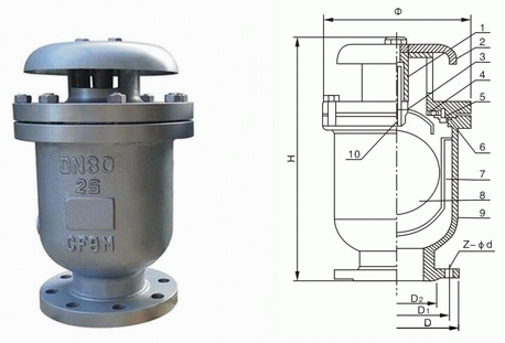 組合式快速進排氣閥是一種由閥體、浮球、升降罩、排氣孔密封組件、閥蓋及排氣罩等組成,具有一大一小兩個排氣孔的進排氣閥,其當管道空管沖水時,在工作壓力下可自動快速排出管道中集結的空氣:當管道內產生負壓時可自動進氣,排氣后能夠自動封水。本產品有整體式和分體式兩種,整體式在管內正常輸水,浮球上端與閥體間形成壓力氣囊時,浮球能及時靈活下降,在工作壓力下,打開閥門的小孔將壓力氣囊內的氣體排凈。