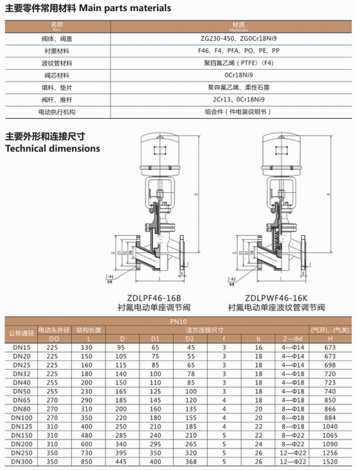 電動襯氟調(diào)節(jié)閥零件材料、外形和連接尺寸: