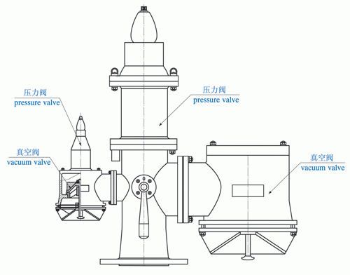 依據(jù)IMO和IBC規(guī)范,每只貨油艙需設(shè)兩套透氣裝置或一套透氣裝置加一套液貨壓力傳感器,以防止其中之一出現(xiàn)故障時也能確保艙內(nèi)不超壓或失壓。因此,經(jīng)認可的各規(guī)格高速透氣閥,也可以將其中一個規(guī)格作為附件與主流量閥組合在一起。壓力設(shè)定成主流閥為正常工作壓力,附件閥為保險壓力。這樣的透氣方式既可最大限度地防止貨油艙超壓或失壓。同時,在裝載速率允許的情況下,也可以作為增大裝載速率的補助裝置,但這種透氣裝置成本較高。