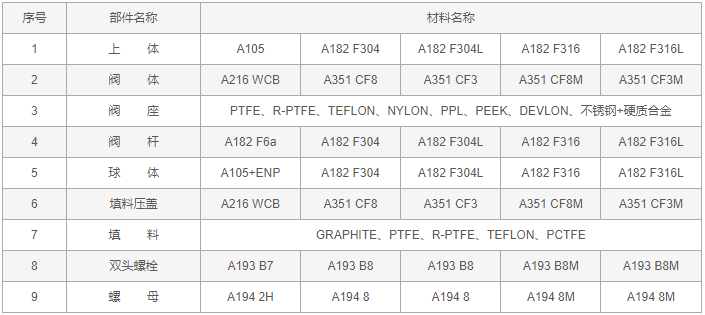 罐底放料球閥零件材料:
