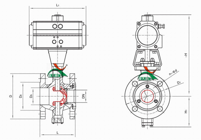 氣動帶手動V型球閥外形結(jié)構(gòu)圖: