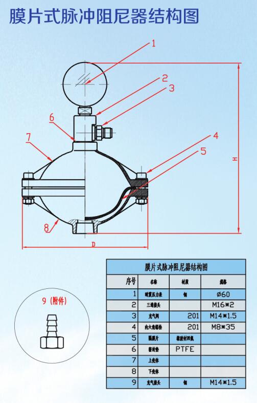 膜片式脈沖阻尼器分為上下殼體,中間由聚四氟乙烯、橡膠復合膜片分隔,是常用的脈沖阻尼器。最大的優(yōu)點就是隔膜將預充氣體和管路中的液體分開,方便維護,在合適的選型、充壓條件下,能夠減少絕大多數(shù)的脈沖。膜片式結構,介質(zhì)和壓縮氣體分離,保證長期穩(wěn)定運行。接觸介質(zhì)部分只有下殼體和膜片,常規(guī)膜片采用橡膠襯四氟形式,四氟做過多向滾壓處理,耐腐蝕性好,使用壽命高。