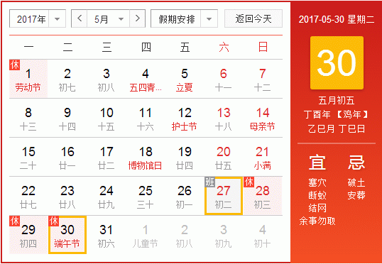 2017年端午節(jié)放假時間為:5月28日—5月30日,共3天。其中5月30日為法定節(jié)假日,5月31日(星期三)照常上班。請大家合理計劃時間,提高工作效率,落實好節(jié)前各項工作任務安排。 祝大家端午節(jié)快樂!